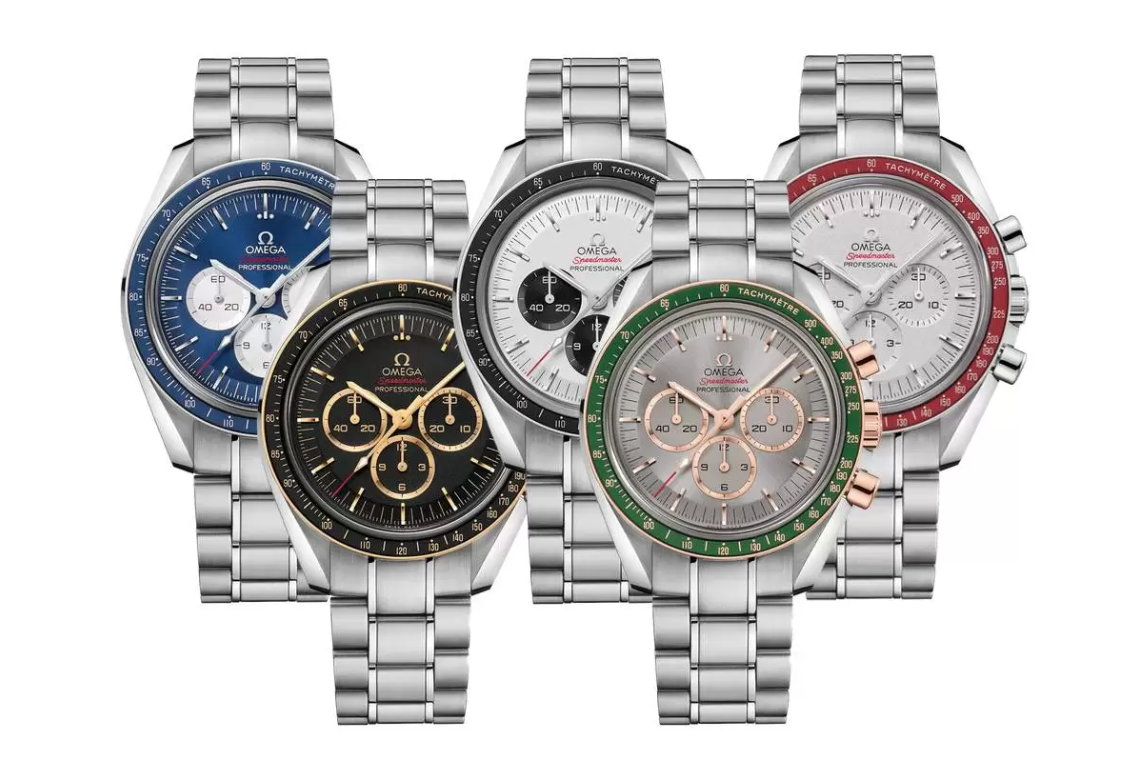 The Omega Speedmaster Tokyo 2020 Olympics collection launched in 2018 includes five watches, all based on the classic Speedy Professional Moonwatch in a sapphire crystal version, each with a design inspired by the five colors of the Olympic flag – the blue, yellow, black, green and red rings. depicting the five continents.